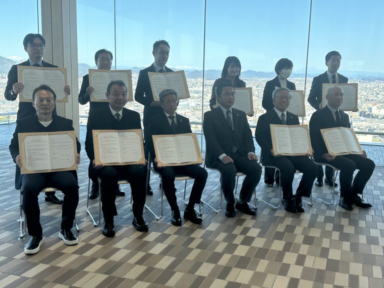 2月28日岐阜県庁にて締結式が執り行われ、当社を含む民間事業者が岐阜県知事と協定書を取り交わしました。当社は、施設内の家具などに岐阜県産材を積極的に利用していくことで、脱炭素社会・循環型社会の実現や地域経済の活性化に貢献してまいります。